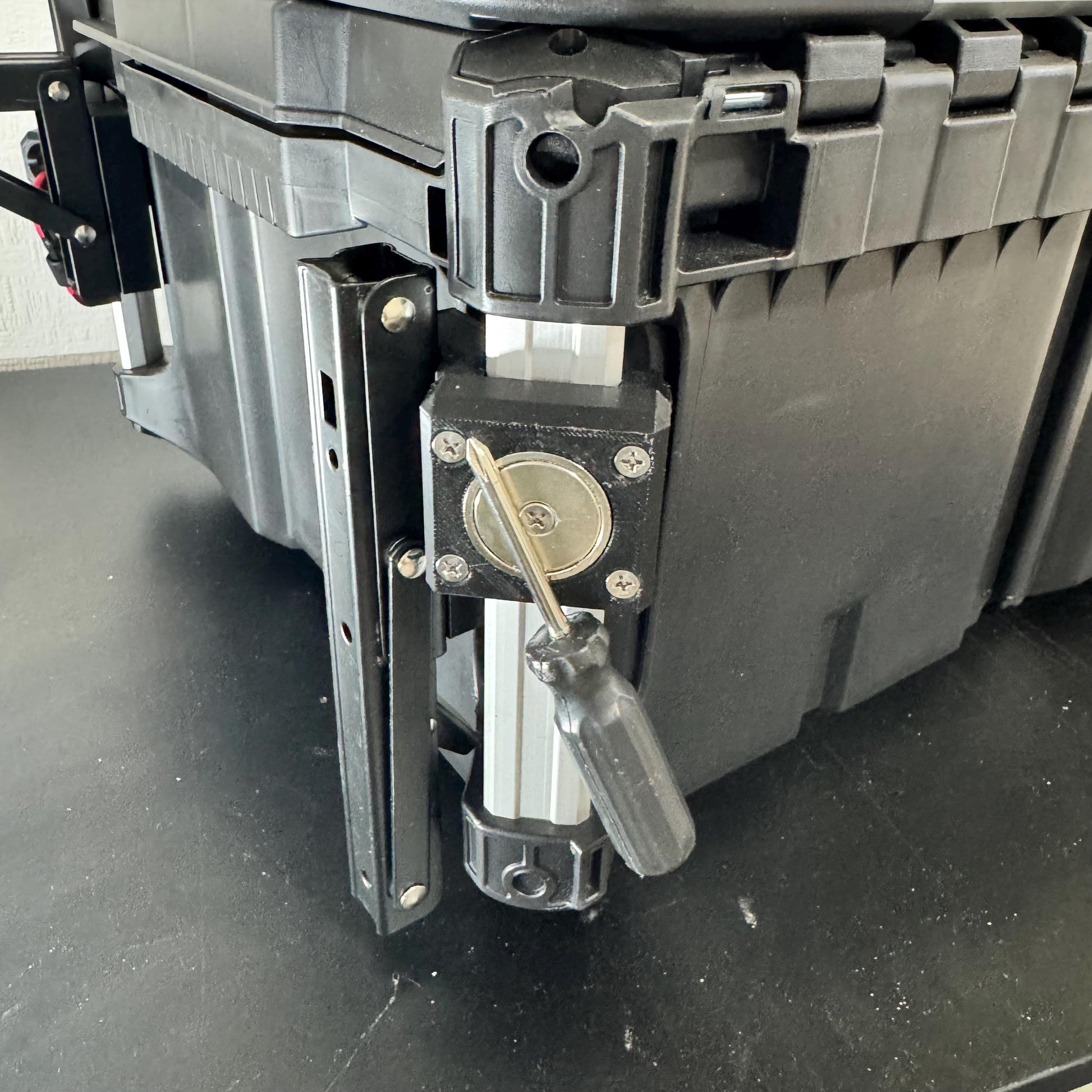 Upgrade your Milwaukee Packout setup with this flip-up table mount system – designed for quick deployment and easy removal with no drilling or modification required. This kit includes two foldable hinges, one anchor bracket with a carabiner, and one magnet mount, all designed to clamp securely to the Packout rail system without taking anything apart.